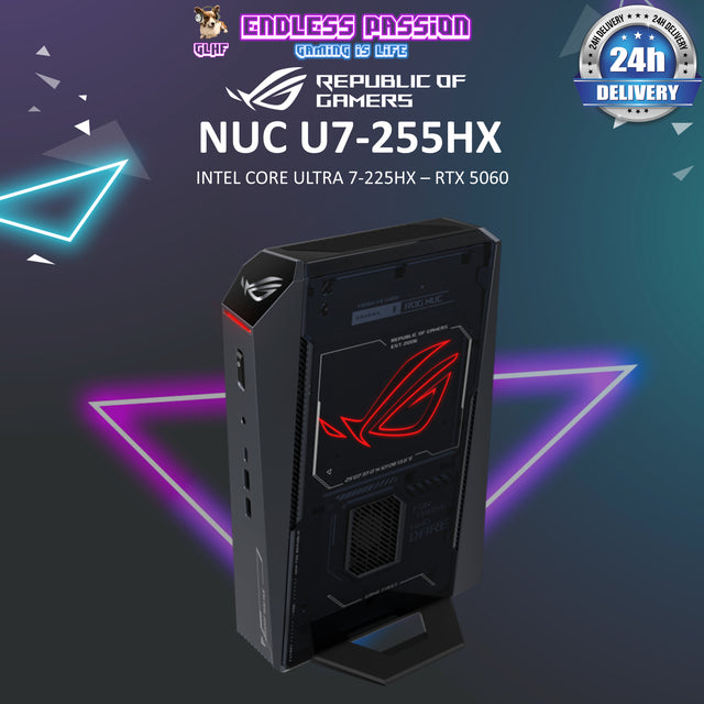 ROG NUC U7-255HX RTX5060 DDR5 16G 1TB Win 11 Home Next-Gen Gaming Mini PC with Intel® Core™ Ultra 7 (Series 2) processor and NVIDIA® GeForce RTX™ 5060 Laptop GPU, triple-fan cooling, and support for four 4K displays.