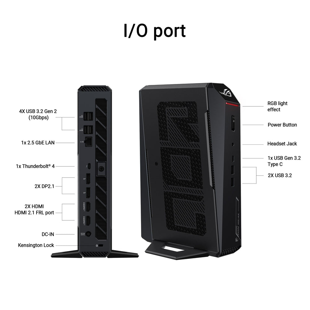 ROG NUC (2025) U9-275HX RTX 5070Ti DDR5 16Gx2 1TB SSD WIFI 7 Win 11 RNUC15JNK9X389A0 Next-Gen Gaming Mini PC with Intel® Core™ Ultra 9 (Series 2) ARL-HX and NVIDIA® GeForce RTX™ 5070Ti Laptop GPU, triple-fan cooling, and support for four 4K displays.