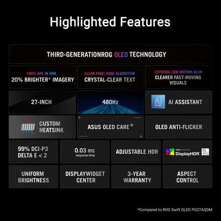 ROG Swift OLED PG27AQDP gaming monitor ― 27-inch (26.5-inch viewable) WOLED panel, 480 Hz (above 360Hz), 0.03 ms (GTG), G-SYNC® compatible, custom heatsink, ASUS OLED Care+, AI Assistant, VESA DisplayHDR™ 400 True Black, uniform brightness, 99% DCI-P3, true 10-bit color, and DisplayWidget Center