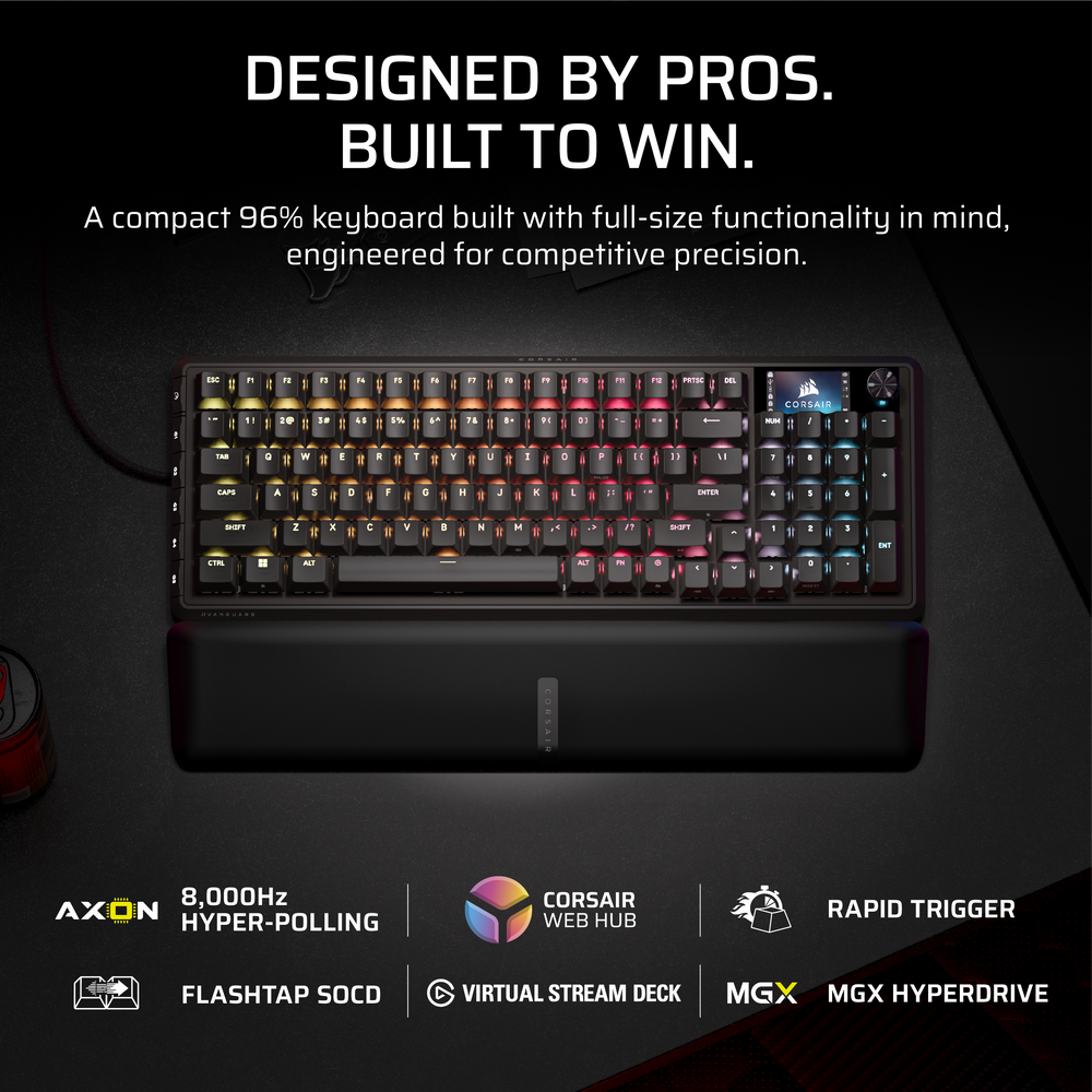 CORSAIR’s VANGUARD PRO 96 is a high-performance mechanical keyboard that continues CORSAIR’s game-changing legacy of innovation. Built for competitive players featuring magnetic MGX Hyperdrive Hall Effect switches and 8,000Hz hyper-polling for an edge in responsiveness. The optimized 96% form factor packs arrow keys, a numpad, an LCD screen, 6 G-keys, and a rotary dial into a footprint comparable to a TKL. It’s also hotswappable, enhancing compatible magnetic switches with quad-layer sound dampening for satisfying acoustics. VANGUARD PRO 96 features Elgato Virtual Stream Deck integration, FlashTap SOCD handling, Rapid Trigger, dual-actuation points, and customization via our lightweight web-based utility, CORSAIR Web Hub.