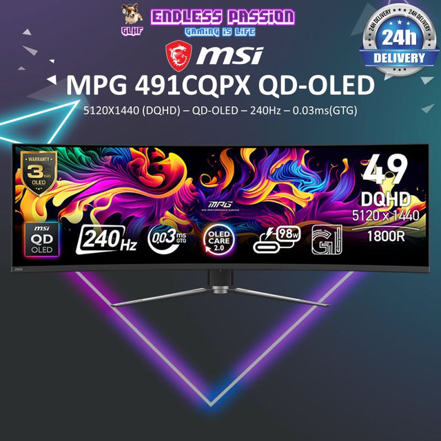 Visualize your victory with the MPG 491CQPX QD-OLED gaming monitor. It boasts a 5120x1440 (DQHD) 1800R curved next-gen QD-OLED panel, 240Hz refresh rate, and rapid 0.03ms(GtG) response time. VESA certification for ClearMR 13000 and DisplayHDR True Black 400 ensures exceptionally vivid images and mitigates motion blur. OLED Care 2.0 reduces OLED burn-in risks. For console gamers, the MPG 491CQPX QD-OLED provide HDMI 2.1 ports with 48Gbps bandwidth, 120Hz support, VRR, and ALLM.
