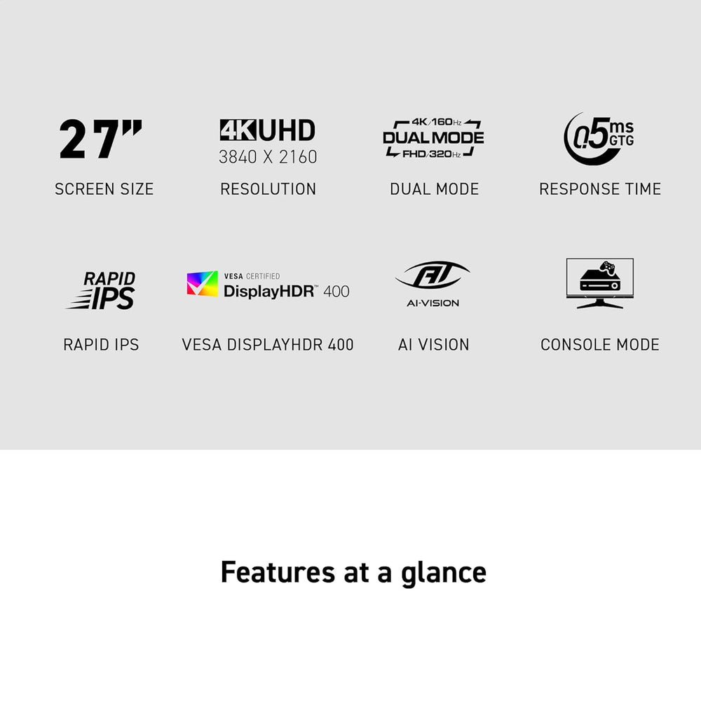 Experience immersive gaming with the MAG 272URDF E16 gaming monitor. Featuring Dual Mode with UHD 160Hz and FHD 320Hz, along with AI Navigator for an enhanced gaming experience, it delivers exceptional performance. Certified with VESA DisplayHDR 400, it refines contrast and shadows for stunning visual clarity. Designed for competitive FPS, first-person RPG/MMORPG, and flight/racing simulators, the MAG 272URDF E16 redefines casual gaming, pushing players to see beyond the game.