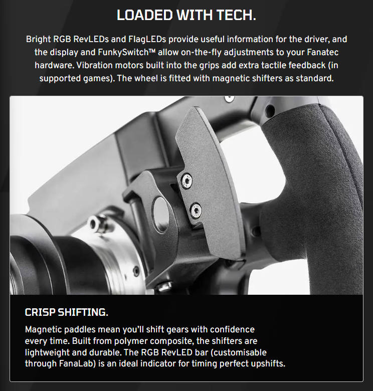 • Two FlagLEDs with three multi-colour RGB LEDs each to indicate tyre slip, flag warnings, pit limiter, and more, programmable by the user via FanaLab and by game developers via the Fanatec SDK