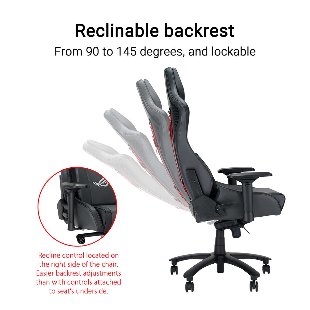 ROG Chariot X Core gaming chair in racing-car style, featuring an adjustable high-density foam headrest, memory-foam lumbar support, 4D armrests, tilt mechanism, durable class 4 gas lift, and durable premium PU leather for a premium gaming experience.