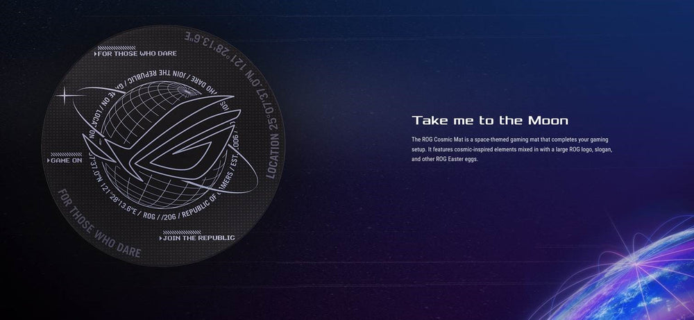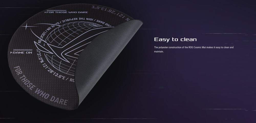 The ROG Cosmic Mat is a special edition, space-themed mat featuring a large ROG logo and other ROG-inspired elements. Made from polyester and featuring a non-slip rubber base, the ROG Cosmic Mat stays firmly in place, resists curling, and suppresses noise made by chair casters.