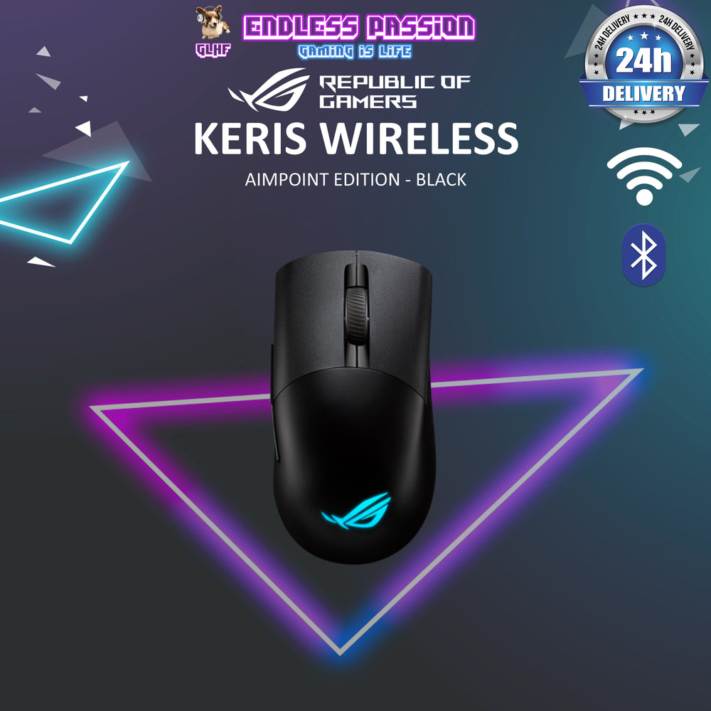 The ROG Keris Wireless AimPoint lightweight 75-gram wireless RGB gaming mouse features a 36,000 dpi ROG AimPoint optical sensor, tri-mode connectivity, ROG SpeedNova wireless technology, swappable mouse switches, ROG Micro Switches, PBT buttons, ROG Paracord, 100% PTFE mouse feet, five programmable buttons, ROG mouse grip tape.