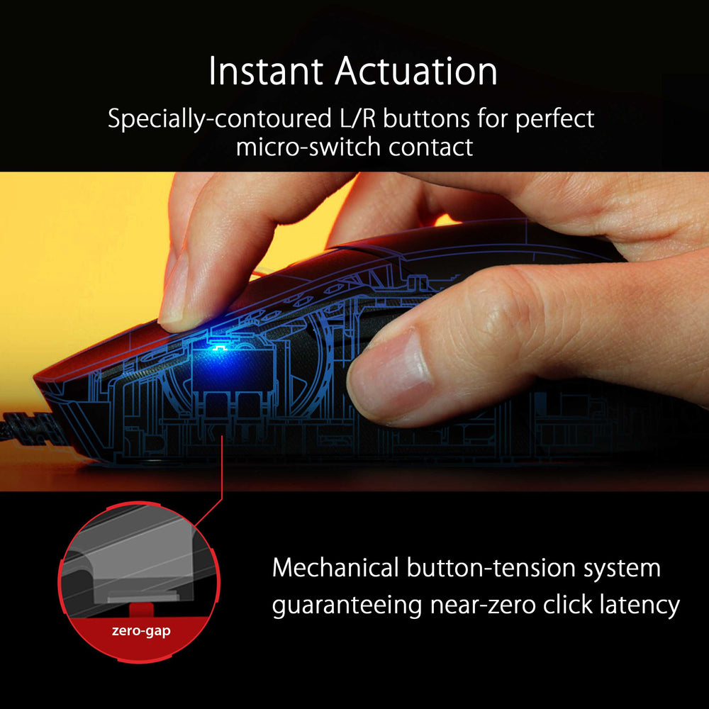 ROG Strix Impact III is a lightweight, ambidextrous form factor, 59-gram wired RGB gaming mouse, suitable for FPS gameplay, featuring a 12,000-dpi optical sensor, near-zero click latency, swappable mouse switch sockets, ROG Micro Mouse Switches, ROG Paracord, 100% PTFE mouse feet, and a durable design.