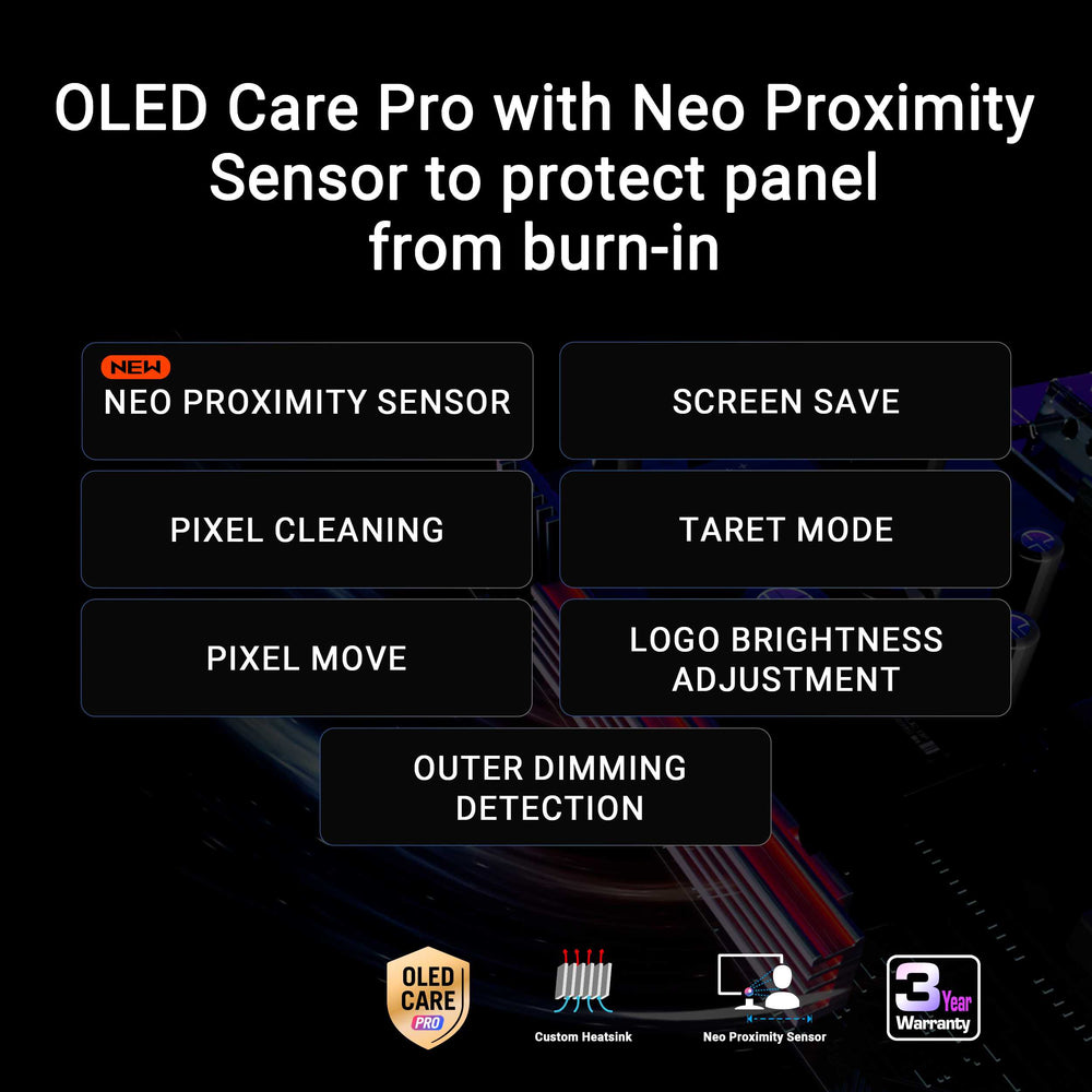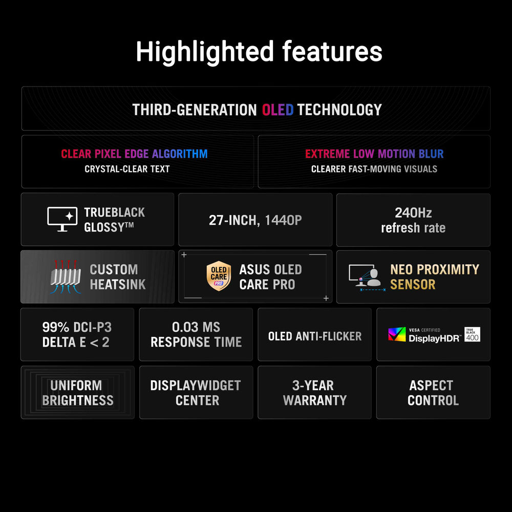 The ROG Strix OLED XG27AQDMGR is a 27-inch TrueBlack Glossy™ WOLED gaming monitor that offers 1440p with a 240 Hz refresh rate. Featuring the new Neo Proximity Sensor within the ASUS OLED Care Pro suite, the monitor is able to detect when the user is away and automatically transition to a black screen to guard against panel burn-in. Thanks to a compact stand, the XG27AQDMGR takes up minimal desktop space. Plus, it offers users an extensive array of connectivity options, including DisplayPort™ 1.4 (DSC), two HDMI® 2.1, and USB
