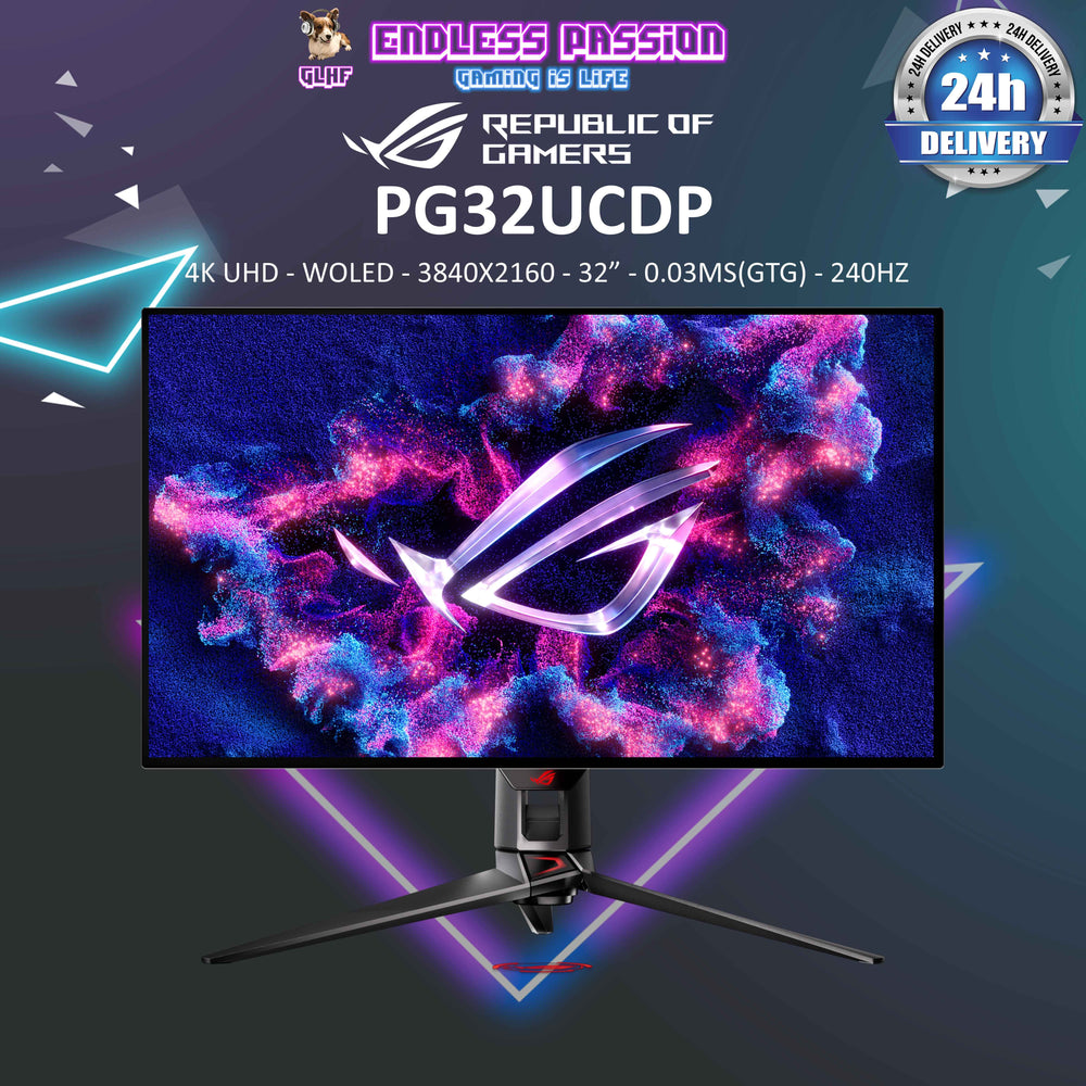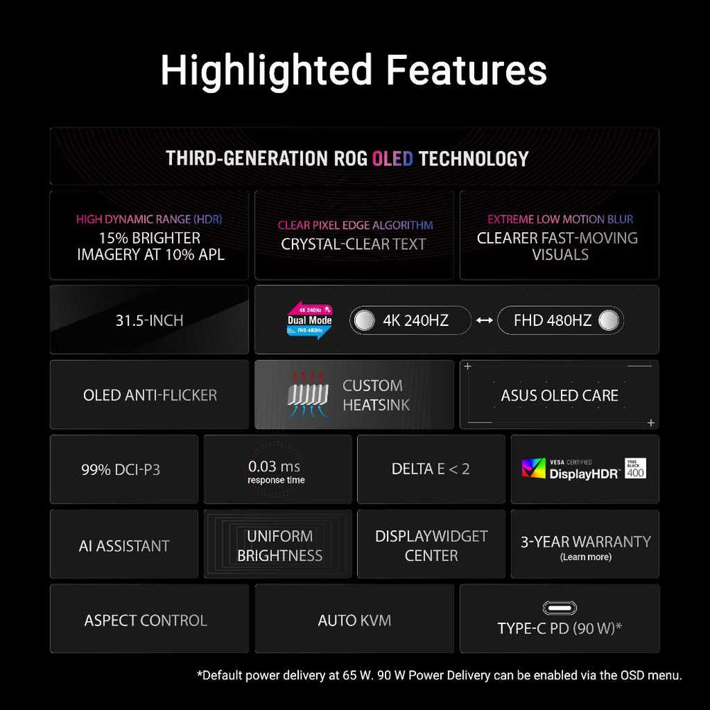 ROG Swift OLED PG32UCDP gaming monitor ― 32-inch (31.5 inch viewable) WOLED panel, dual mode (4K 240Hz or FHD 480Hz), 0.03 ms (GTG), G-SYNC® compatibility, custom heatsink, ASUS OLED Care, AI Assistant, VESA DisplayHDR™ 400 True Black, uniform brightness, 99% DCI-P3, true 10-bit color, Type-C® (90 W PD), and DisplayWidget Center