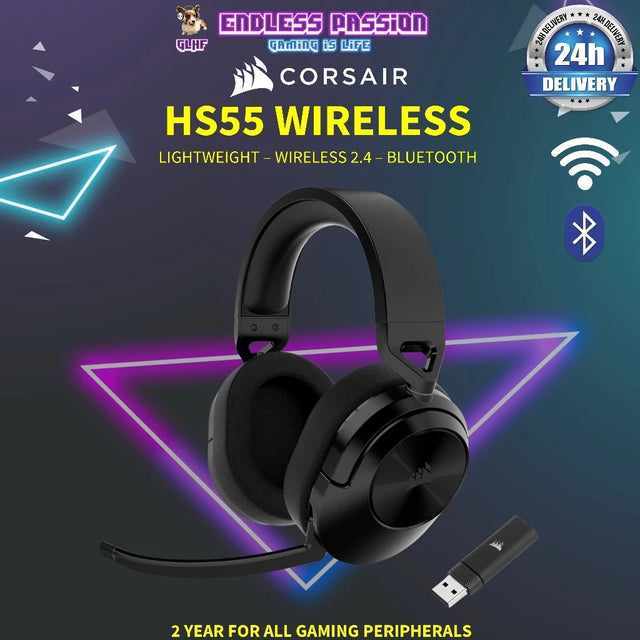 The CORSAIR HS55 WIRELESS Gaming Headset matches low-latency 2.4GHz wireless audio, Bluetooth® and Dolby® Audio 7.1 surround sound on PC and Mac with lightweight construction for essential all-day comfort.