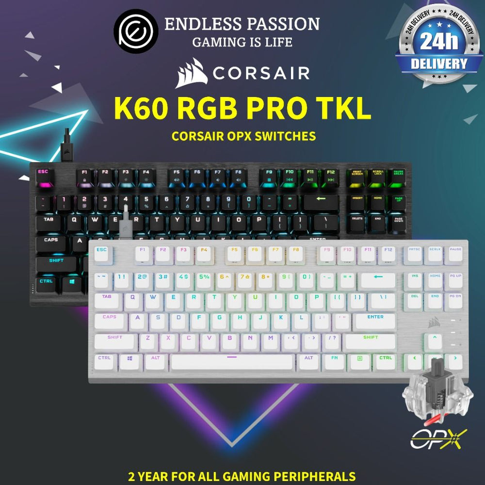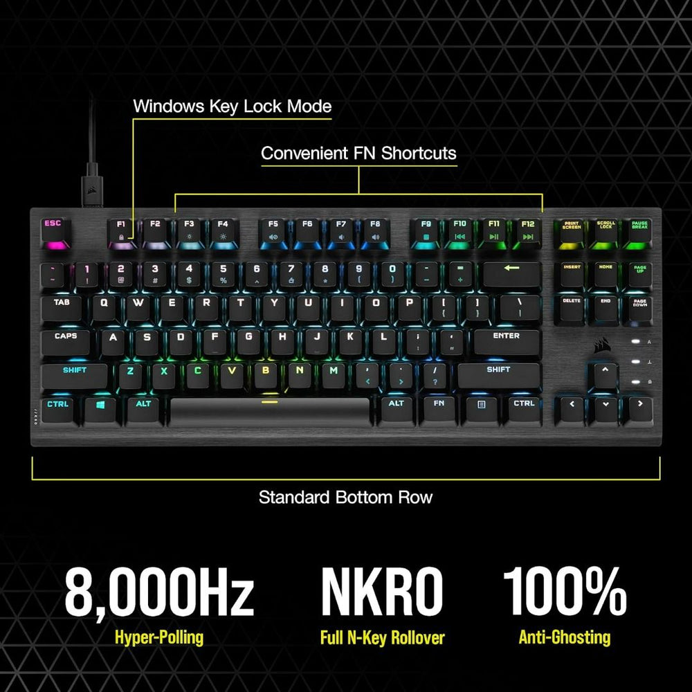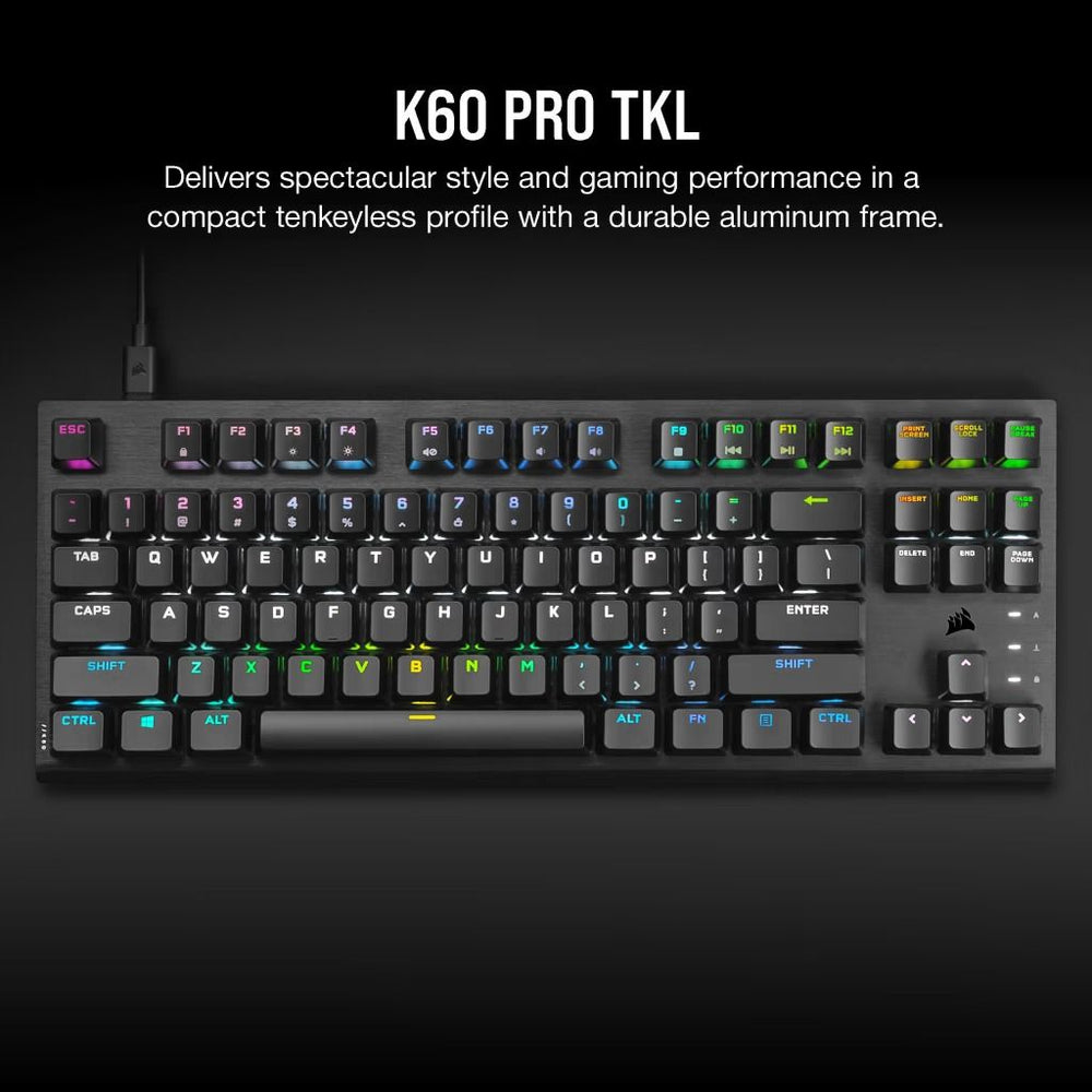 The CORSAIR K60 PRO TKL RGB Tenkeyless Optical-Mechanical Gaming Keyboard - delivers compact style and high performance, with CORSAIR OPX optical-mechanical keyswitches and a durable brushed aluminum frame.