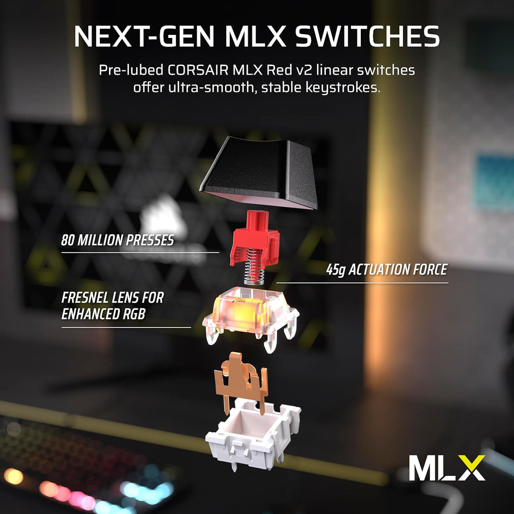 Make your best plays and leave more room for your mouse. The CORSAIR K70 CORE TKL WIRELESS gaming keyboard offers amazing gaming and typing on a compact tenkeyless footprint. Play free from wires via ultra-fast SLIPSTREAM WIRELESS v1.5 or versatile Bluetooth®, up to 1,000 hours between charges. Enjoy silky-smooth, wobble-free keystrokes with pre-lubricated CORSAIR MLX Red v2 linear switches.