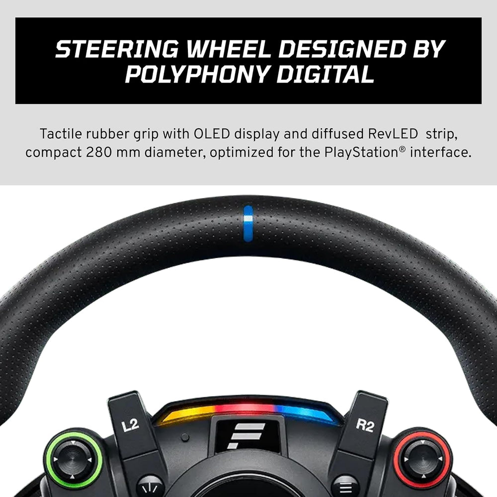 High-performance direct drive wheel base, a licensed Gran Turismo steering wheel and a set of pedals. It features the upgraded QR2 quick release system for a more secure and precise connection.