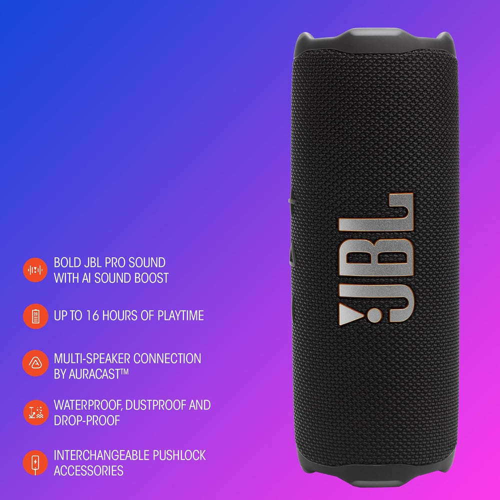 JBL Flip 7 delivers bold JBL Pro Sound with AI Sound Boost for enhanced audio. Built for adventure, it's waterproof, dustproof, and drop-proof with an IP68 rating, offers up to 16 hours of playtime, and supports multi-speaker connection via Auracast™