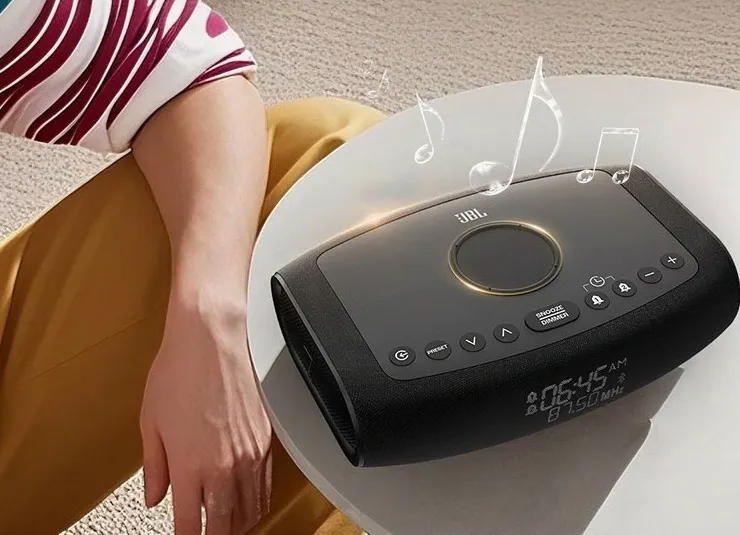 The JBL Rise features a sleek docking style design that blends seamlessly into any space. It comes with an adjustable-brightness LED display with large characters for easy visibility and sports physical buttons for intuitive control.