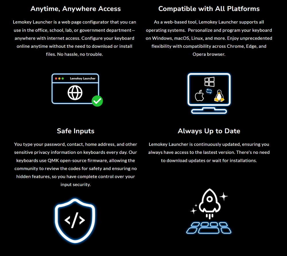 As a web-based tool, Lemokey Launcher supports all operating systems. Personalize and program your keyboard on Windows, macOS, Linux, and more. Enjoy unprecedented flexibility with compatibility across Chrome, Edge, and Opera browseYou type your password, contact, home address, and other sensitive privacy information on keyboards every day. Our keyboards use QMK open-source firmware, allowing the community to review the codes for safety and ensuring no hidden features, so you have complete control over your input security.