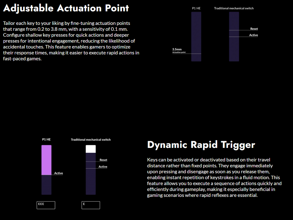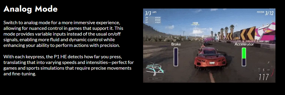 With each keypress, the P1 HE detects how far you press, translating that into varying speeds and intensities—perfect for games and sports simulations that require precise movements and fine-tuning.