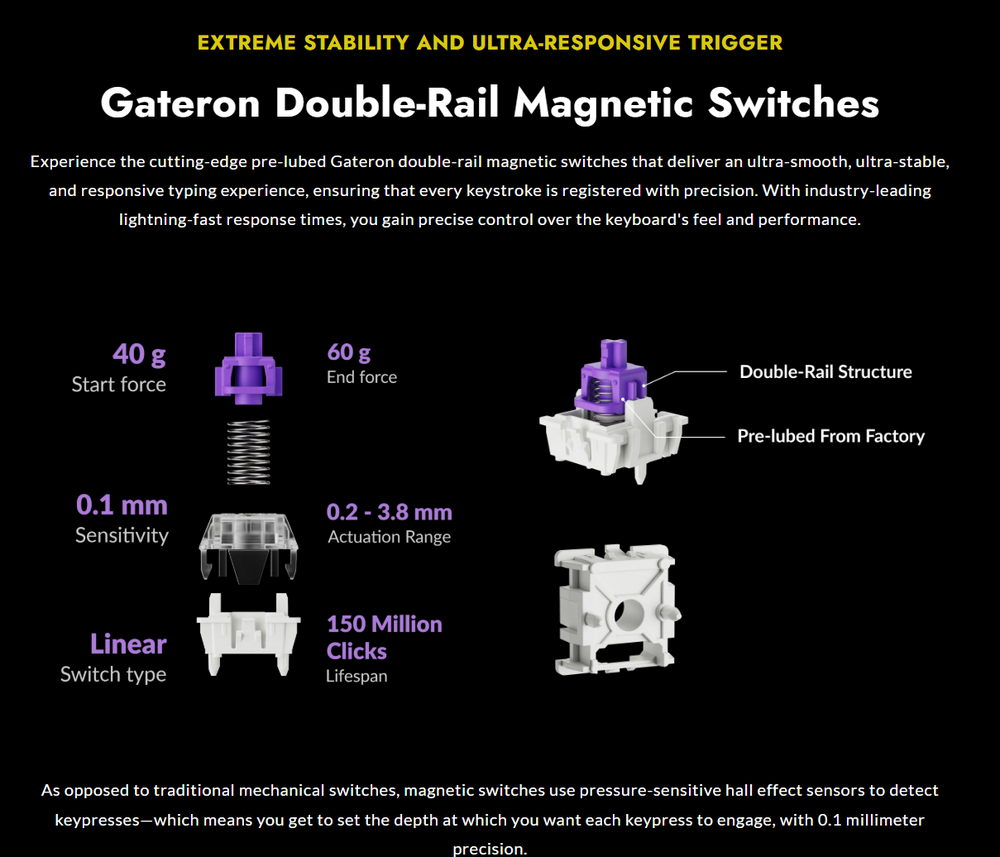 Experience the cutting-edge pre-lubed Gateron double-rail magnetic switches that deliver an ultra-smooth, ultra-stable, and responsive typing experience, ensuring that every keystroke is registered with precision. With industry-leading lightning-fast response times, you gain precise control over the keyboard's feel and performance.